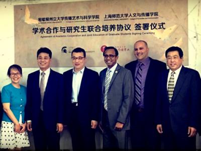 SHNU: On May 8th, Heng Chen, Dean of SHNU College of Humanities and Communications, signed International Academic Cooperation and Development Agreement on Masters’ Degree Candidates Education with Prabu David, Dean of College of Communication Arts and Sciences of MSU. It was also attended by representatives from SHNU International Exchange Office, and SHNU Department of Graduate Students, etc.