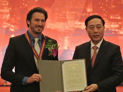 The Shanghai Municipal Government presented Steven Weathers, SHNU foreign teacher from Xiejin Film and Arts College, with its prestigious 2012 Magnolia Silver Award. The Magnolia Silver Award honors foreign citizens who live and work in Shanghai and have made significant contributions to the city’s economic development, social progress and international relations and cooperation. The Award was set up by the Shanghai Municipal Government in 1989 and remains the highest recognition for foreign citizens living in Shanghai。 |