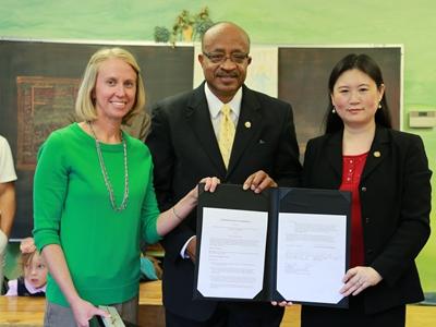 SHNU: A signing ceremony was held recently by the Confucius Institute (CI) of the University of Missouri (MU) and the City Garden Primary School in Columbia,Missouri. According to the agreement, CI was invited to give Chinese lessons to students in City Garden Primary School.